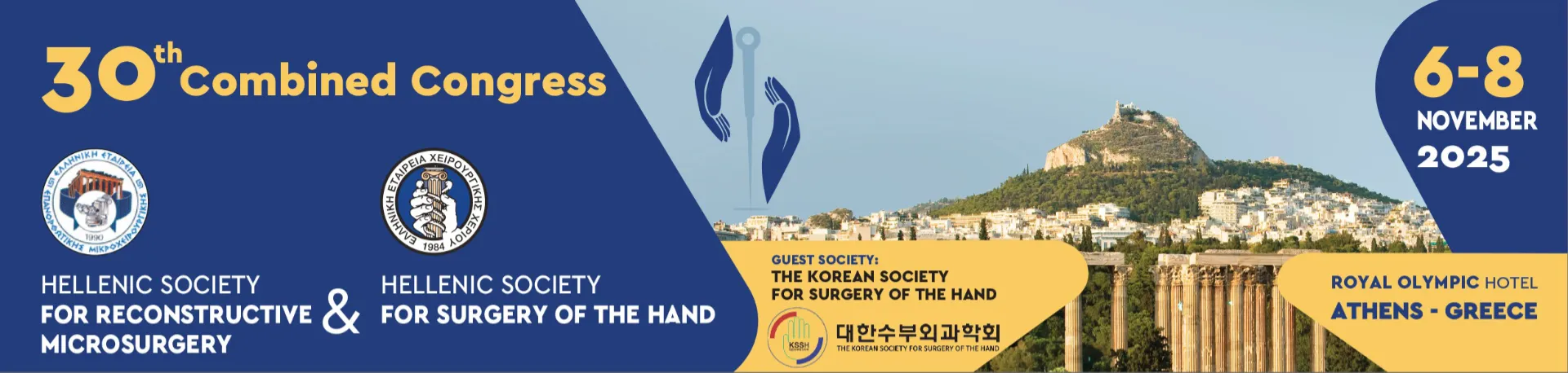 It is with great pleasure that we welcome you to the 30th Combined Congress of the Hellenic Society for Reconstructive Microsurgery and the Hellenic Society for Surgery of the Hand, to be held in Athens, on 6–8 November 2025, at the Royal Olympic Hotel.
